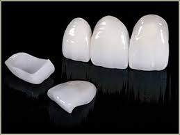 A veneer is a thin layer of porcelain made to fit over the front surface of a tooth, like a false fingernail fits over a nail. Sometimes a natural-color 'composite' material is used instead of porcelain.